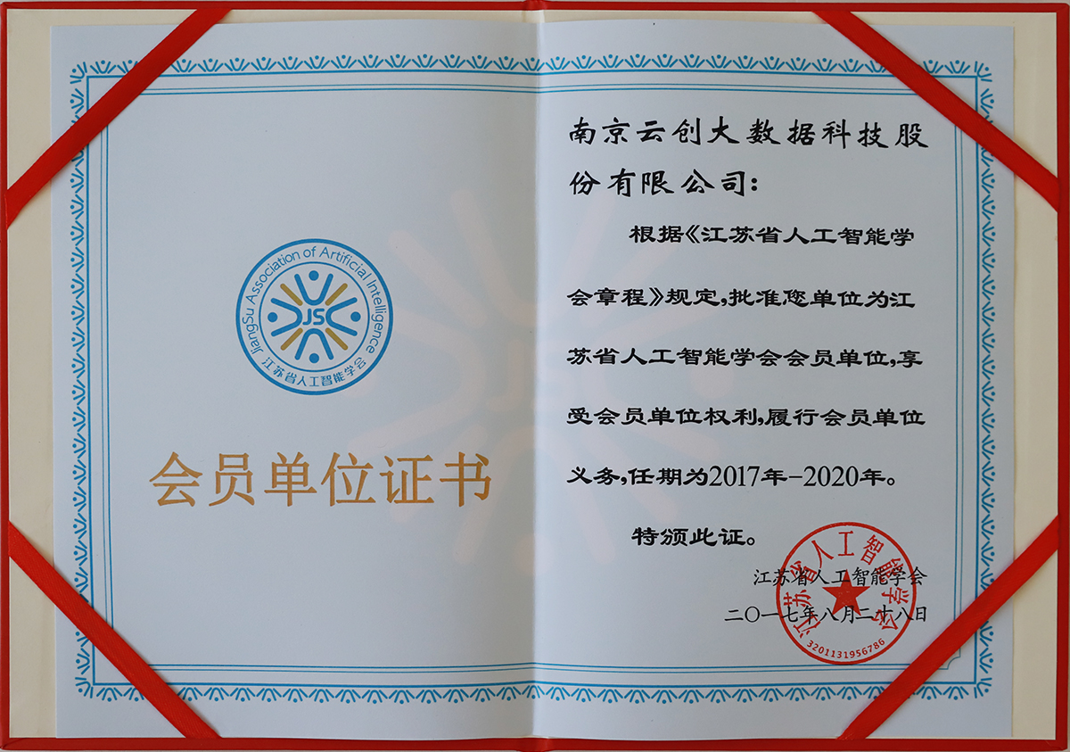 作為家集A(Artificial Intelligence)、B(Big Data)、C(Cloud Computing)于身的公司,云創大數據以知識產權為戰略,研發了眾多具有自主知識產權的物聯網、云計算、大數據和人工智能產品。基于以上優勢,云創大數據得以正式入選“江蘇省人工智能學會會員單位”。