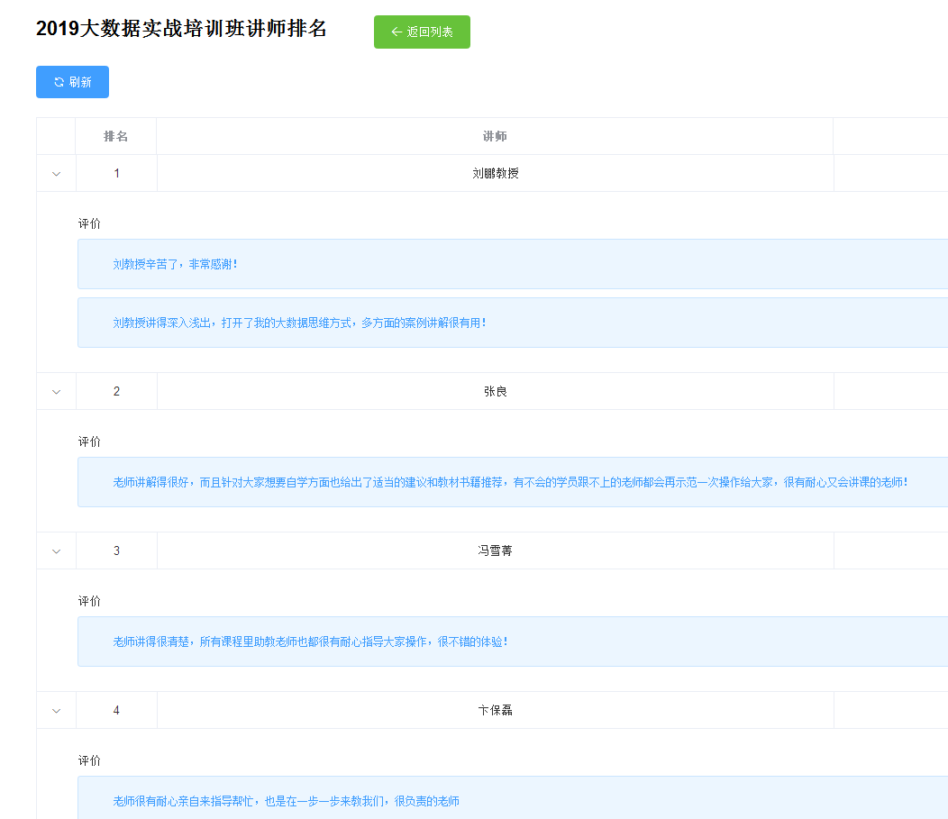 培訓(xùn)過后,由學(xué)員對本次授課的講師進(jìn)行了打分與評價,授課老師均得到學(xué)員們的好評,學(xué)員們評價講師思路清晰、技術(shù)過硬,講解深入淺出、細(xì)致耐心,并因此獲得了很棒的學(xué)習(xí)體驗。