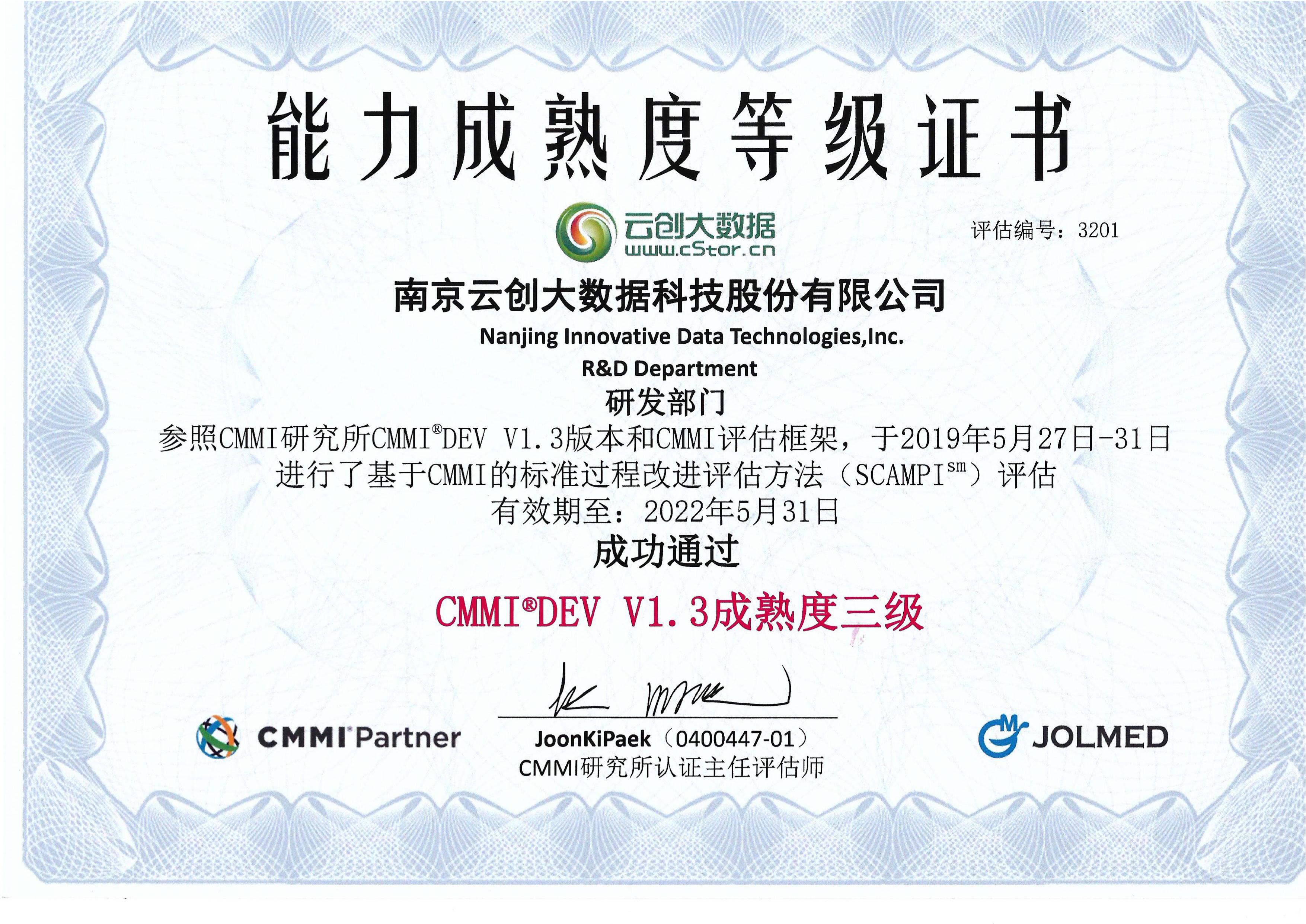 2019年5月31日,在南京云創大數據科技股份有限公司舉行的CMMI3級認證結果發布會上,CMMI Institute Partner 外籍評估師Joonki Paek正式宣布:經過嚴格的現場審核和評估,云創大數據已經達成CMMI3級目標,成功通過CMMI3級認證。