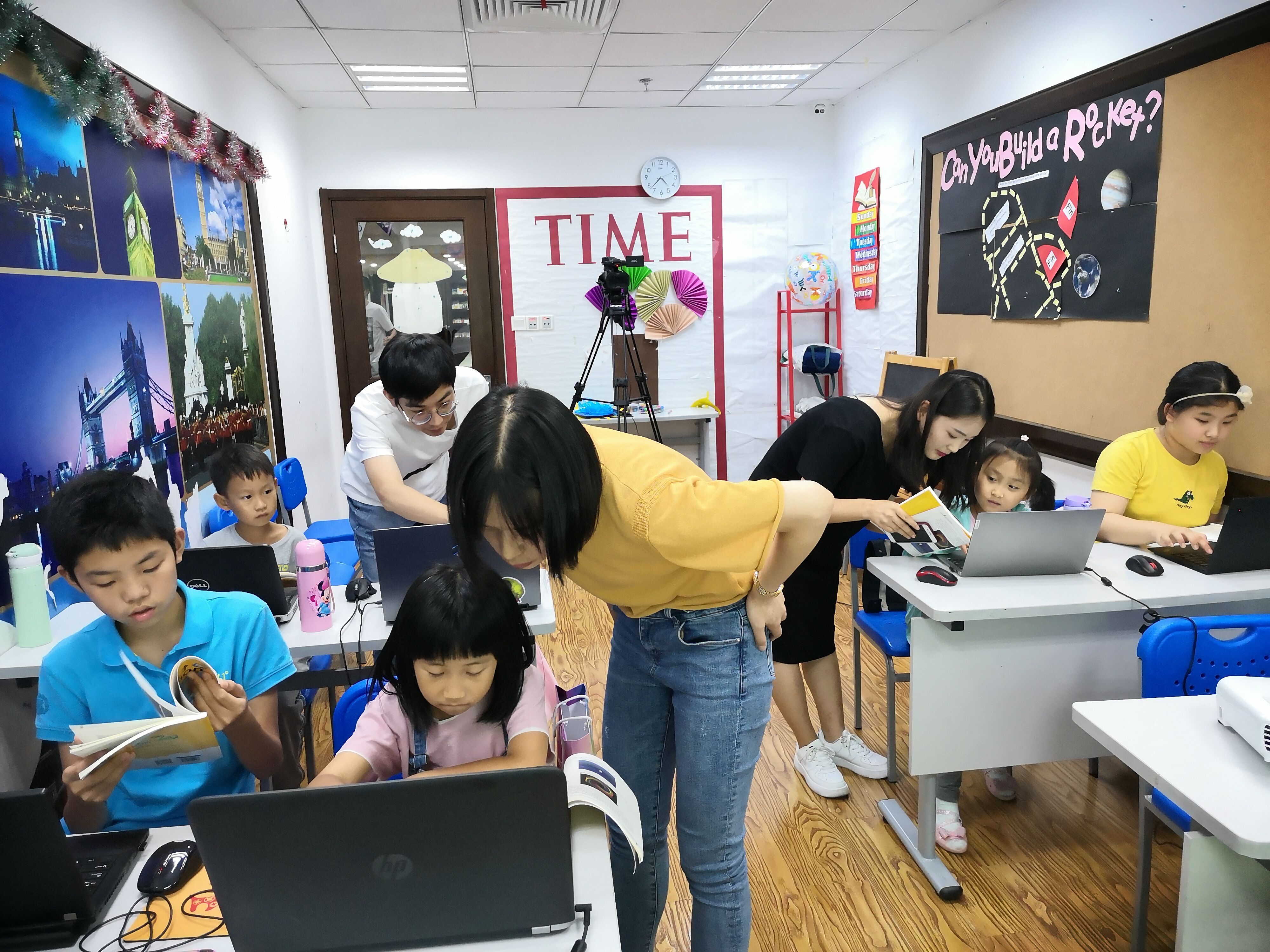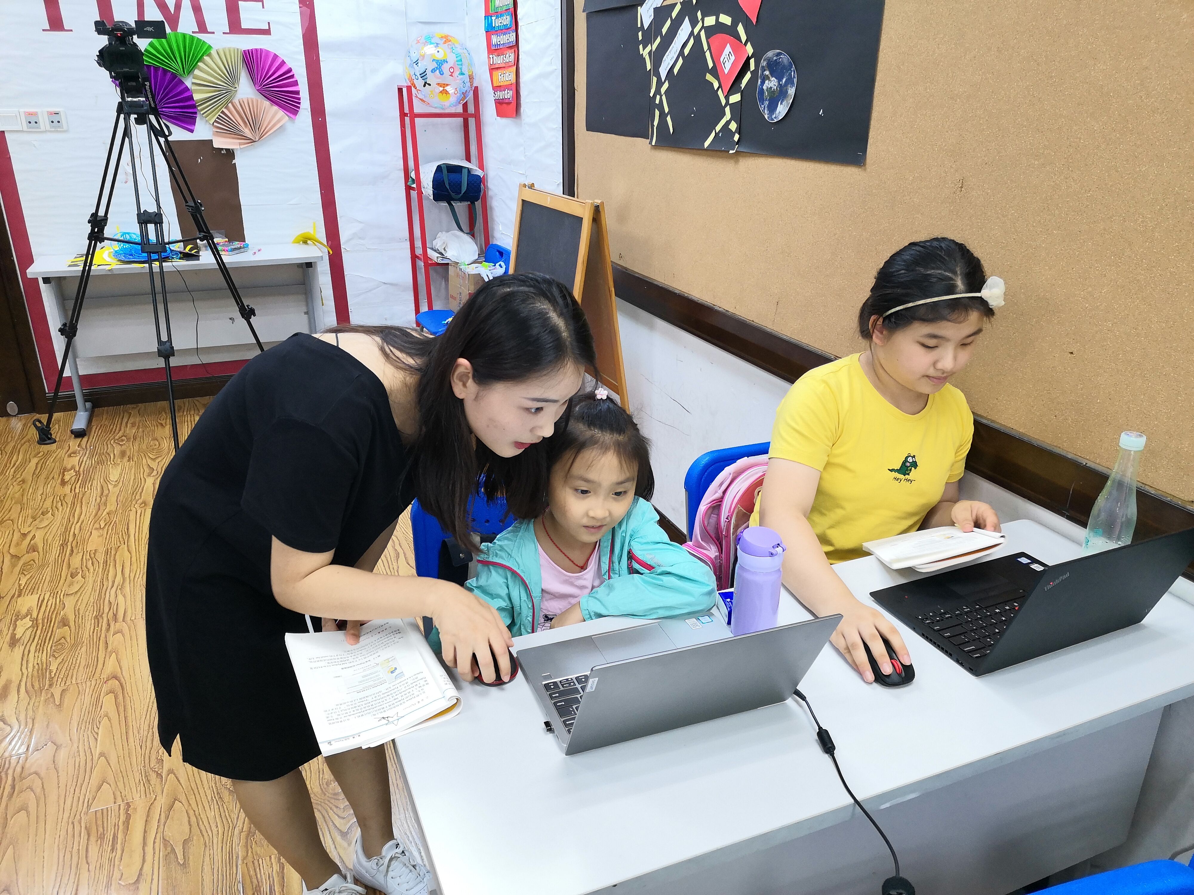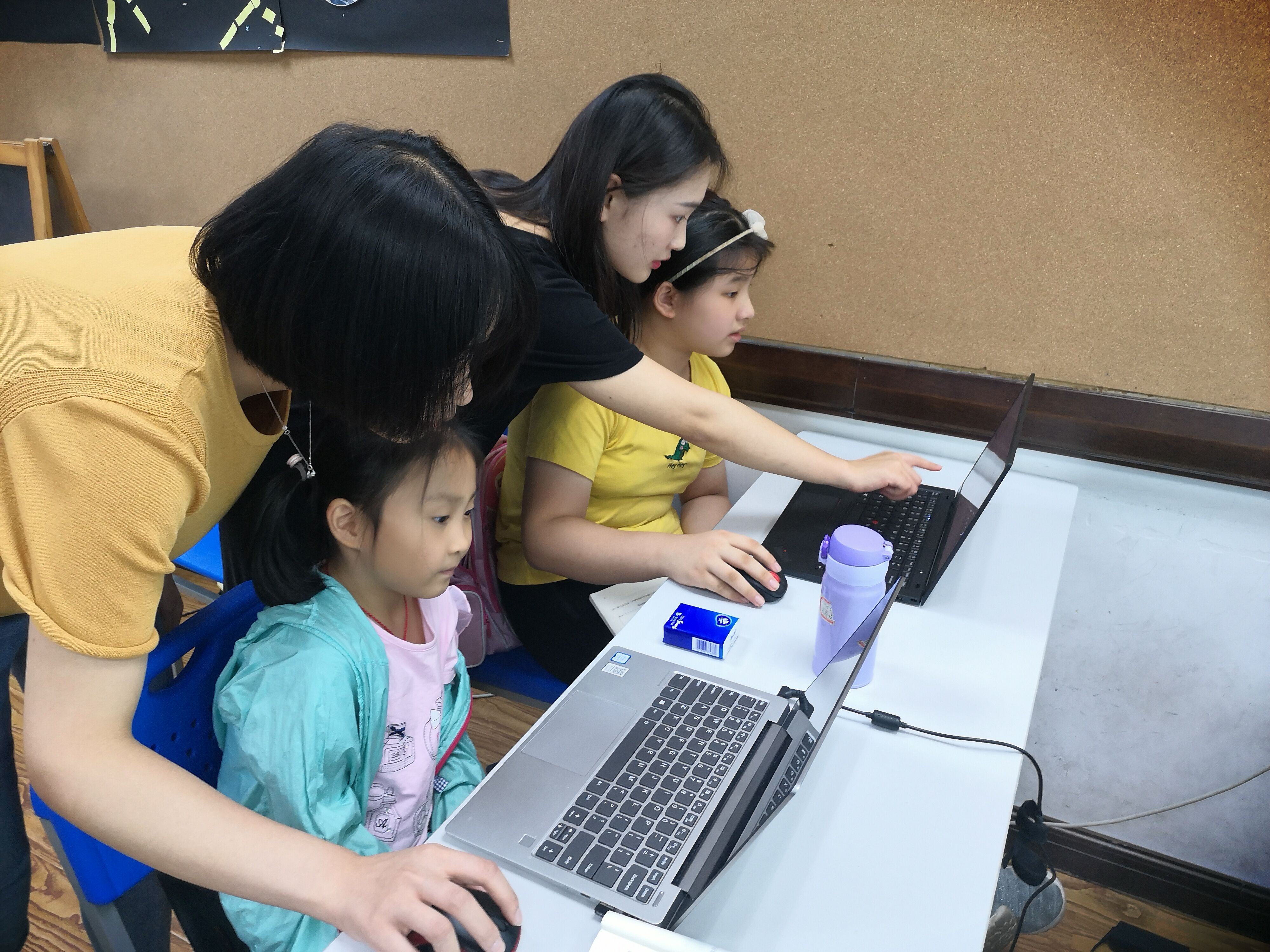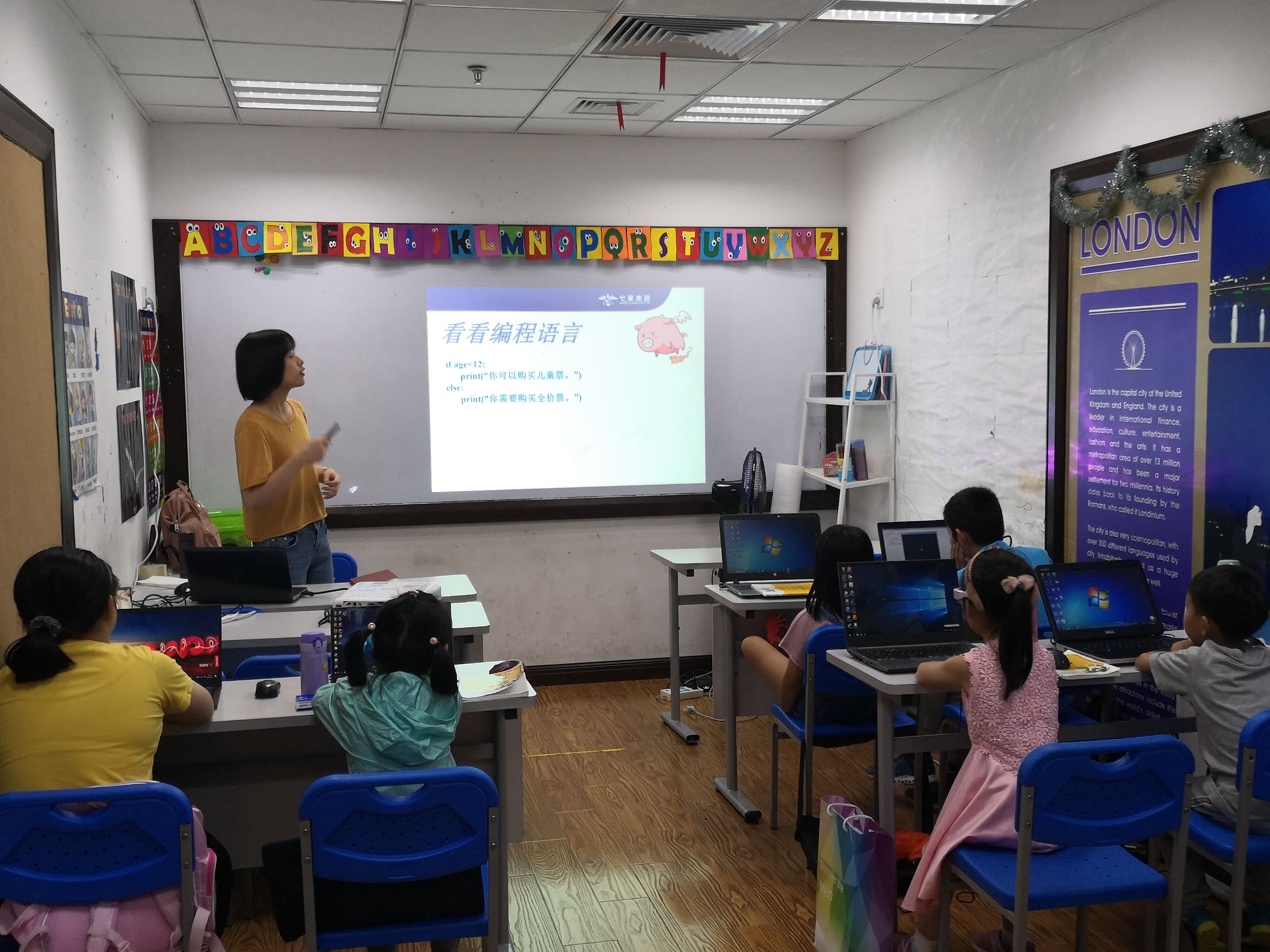 當天的課程,由云創高露擔任主講老師,谷勇老師和弋果美語的悅悅老師擔任助教。小朋友們不僅了解了Python編程語言的基本內容,還完成了Python程序的安裝,并編寫了屬于自己的程序。老師們和藹可親,不僅善于鼓勵小朋友,還全程認真解決小朋友們遇到的每一個問題。