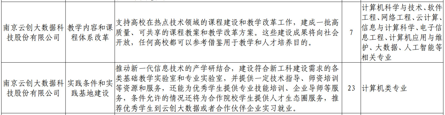 2019年8月12日,教育部高等教育司公布了有關企業支持的“產學合作協同育人項目申報指南”(2019年第一批),云創大數據共有30個產學合作項目獲批,包括“教學內容和課程體系改革”與“實踐條件和實踐基地建設”兩個類別,涉及專業與產業方向涵蓋計算機科學與技術、軟件工程、網絡工程、云計算、信息與計算科學、電子信息工程、計算機應用與維護、大數據、人工智能等。