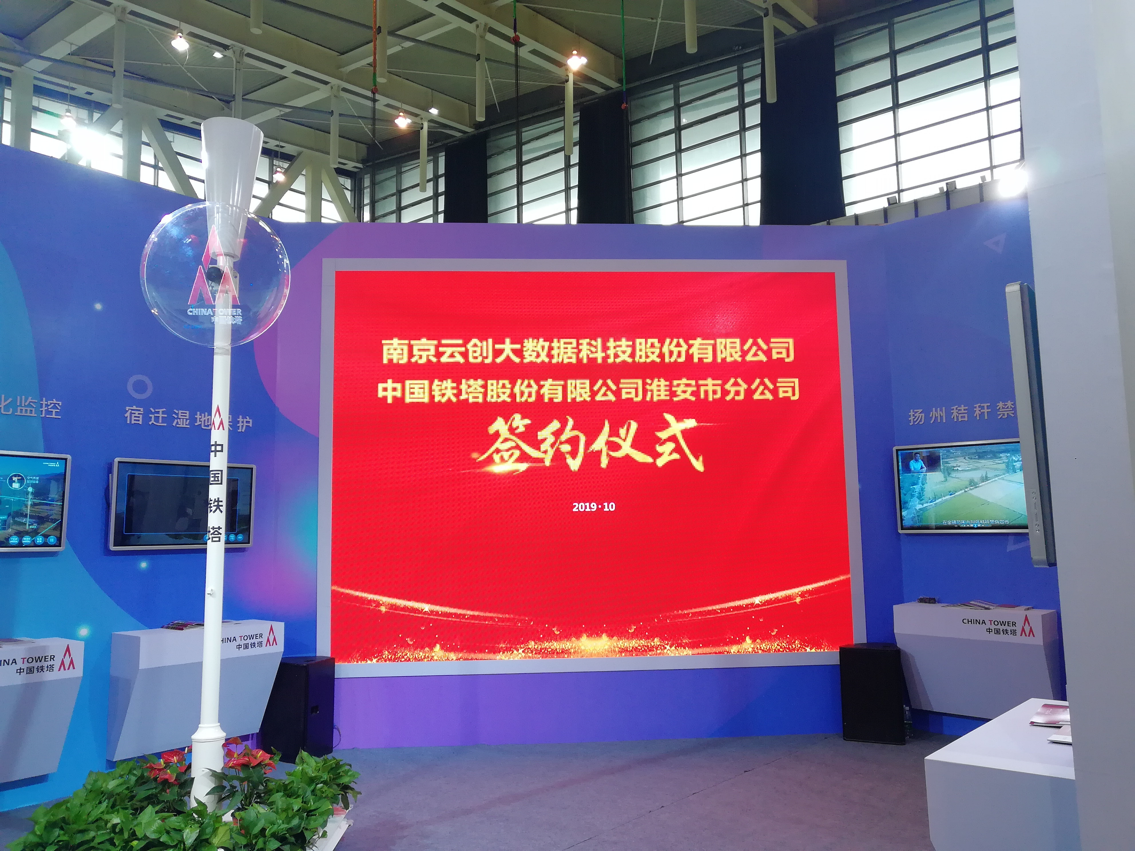 10月11日上午,2019年國際生態環境新技術大會中國鐵塔展區,南京云創大數據科技股份有限公司與中國鐵塔股份有限公司淮安市分公司正式簽訂戰略合作協議。中國鐵塔淮安市分公司副總經理周愛成及部分領導,云創大數據沈大為總監、環境事業部總經理戴鵬、市場總監謝久軍共同出席了簽約儀式。