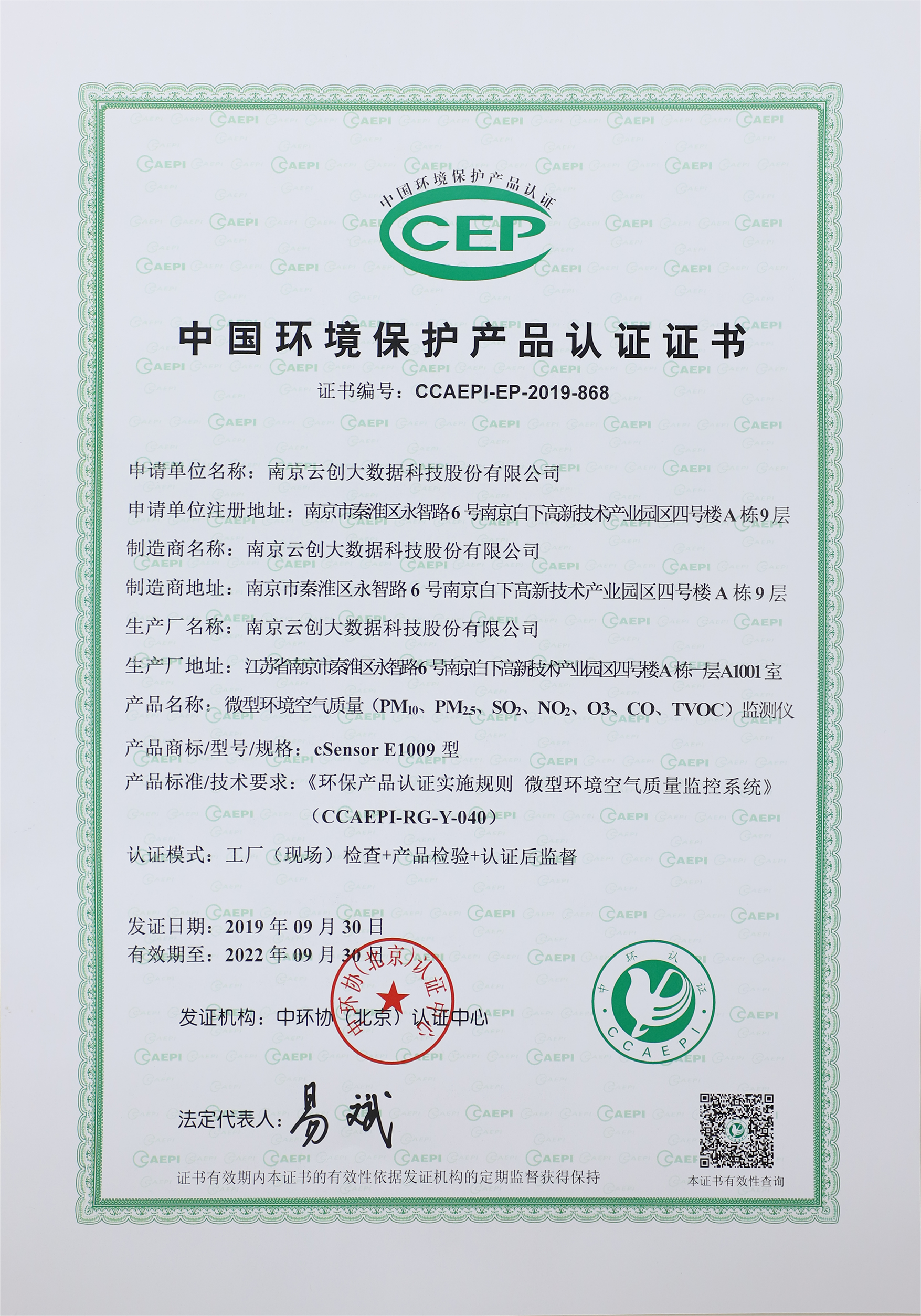 近日,經“工廠(現場)檢查+產品檢驗+認證后監督”等認證模式,云創大數據開發的cSensor E1009微型環境空氣質量監測儀順利通過中國環境保護產品認證。