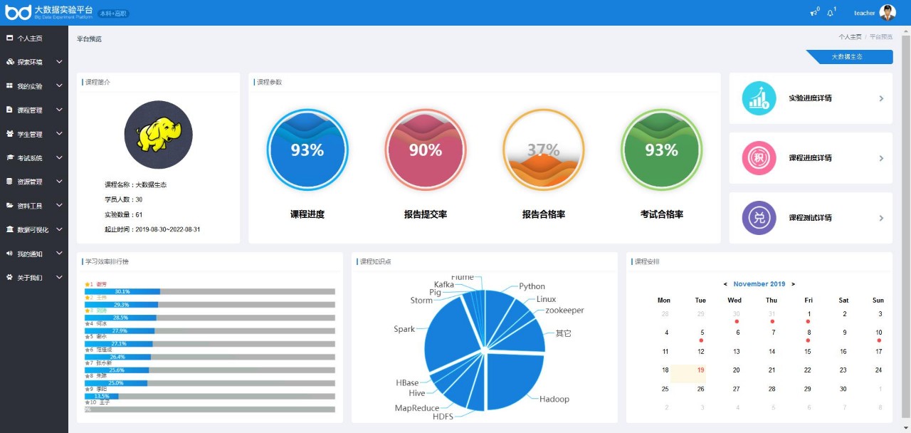 大數據實驗平臺(包括本科與高職兩大平臺,以及金融、電子商務、數學統計等多個版本,目前實驗總數為391個)基于Docker容器技術,一鍵創建實驗環境,支持多人同時在線,實驗相互隔離、互不干擾,集成考試系統(包括試題庫)與數據可視化應用,同步提供詳實的實驗手冊、實驗視頻、教學課件等資源,更好地滿足課程設計、課程上機實驗、實習實訓、科研訓練等需求。