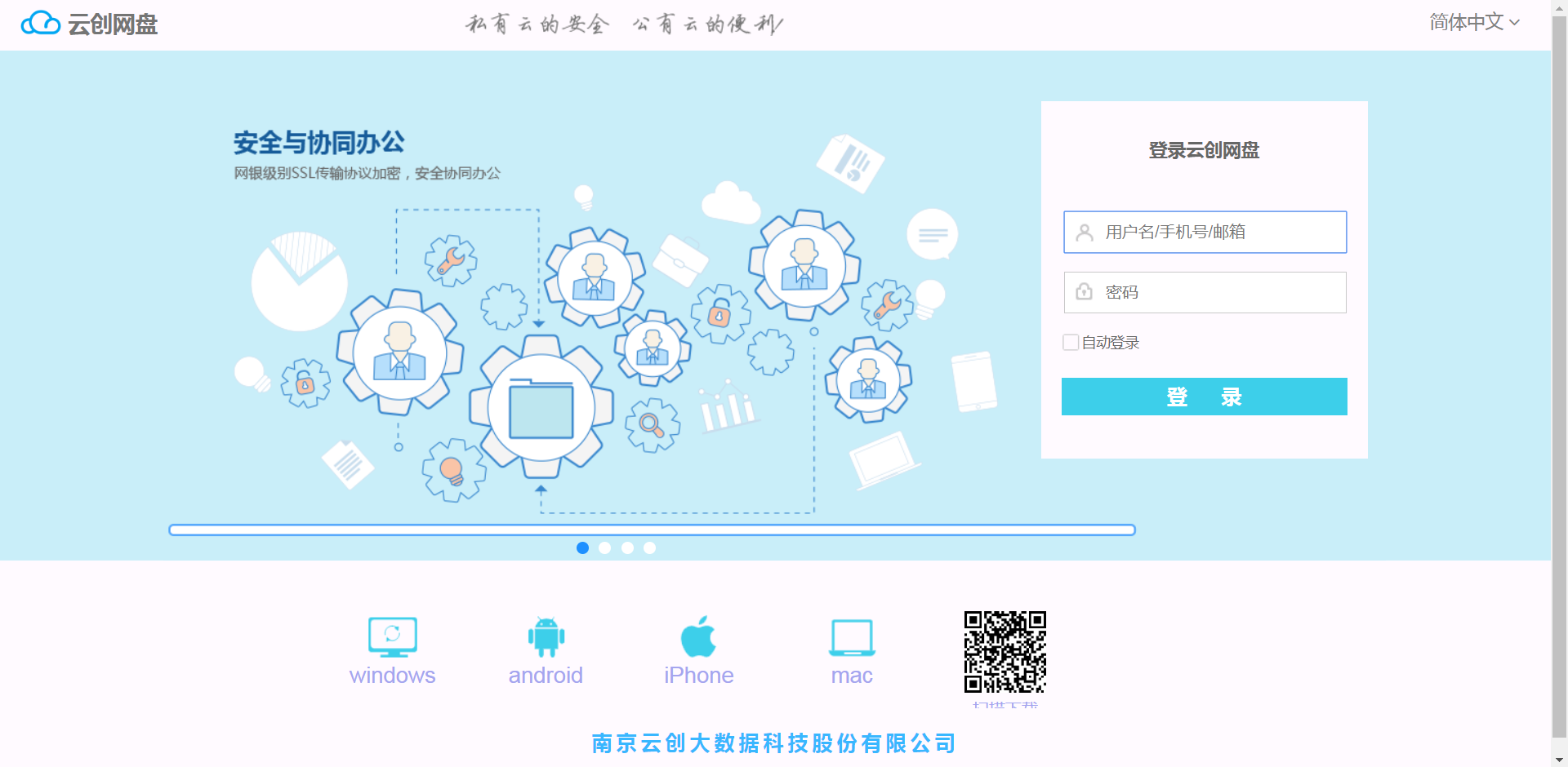 云創網盤為用戶提供Web端以及Windows、iOS、Android等終端同步使用,方便用戶隨時隨地上傳、下載以及分享資源。