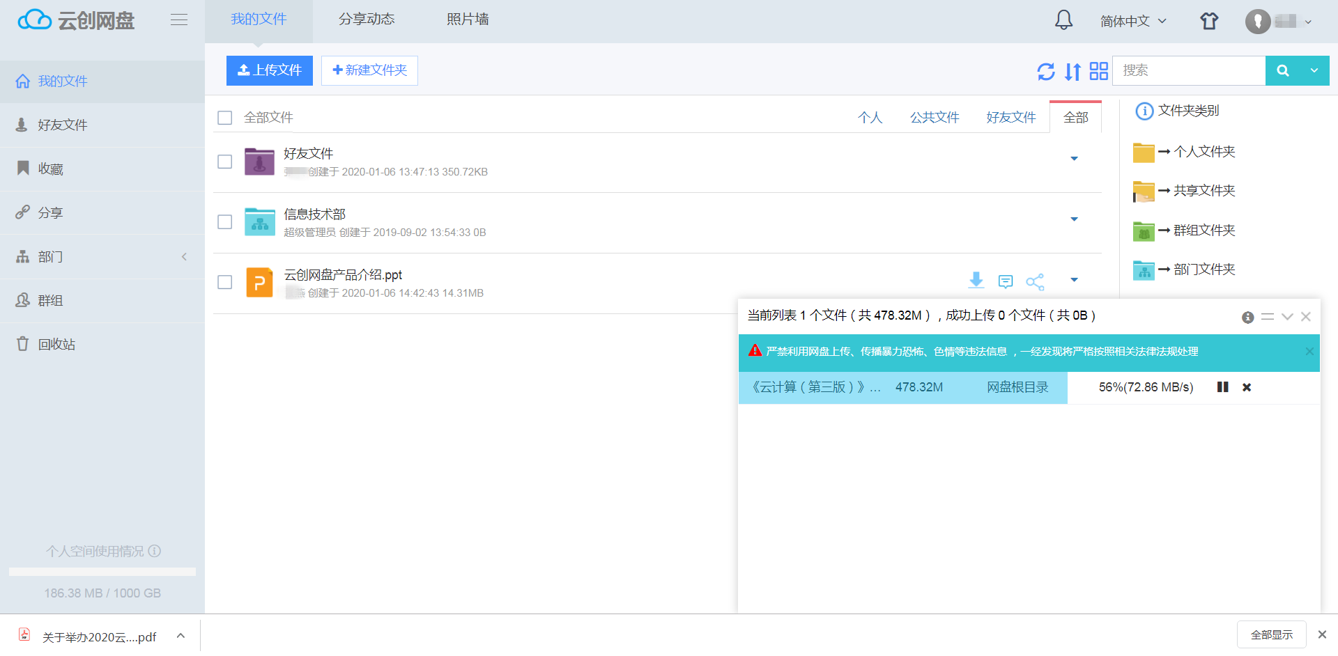 對于大家特別關心的上傳、下載速度,我們通過一個478.32M的PPT進行了測試,幾秒就能上傳完畢,實現了真正的秒傳。