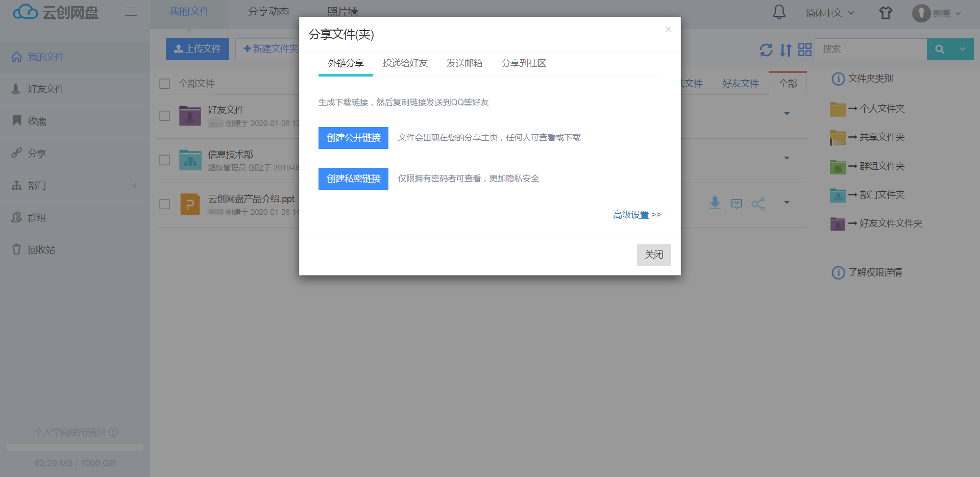 同時,對于分享,云盤網盤提供多種對外分享方式,包括外鏈分享(公開鏈接/私密鏈接)、投遞給好友、發送郵箱以及分享到社區等,為用戶提供多種分享選擇。