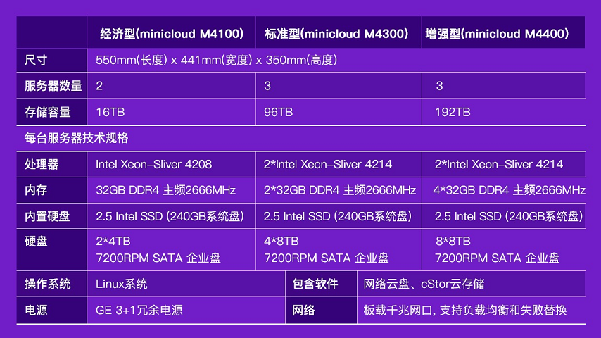 目前,云創網盤為企業提供經濟型、標準型和增強型三種規格,存儲容量分別為16TB、96TB以及192TB,可以滿足不同存儲需要。更多配置詳情參見下表: