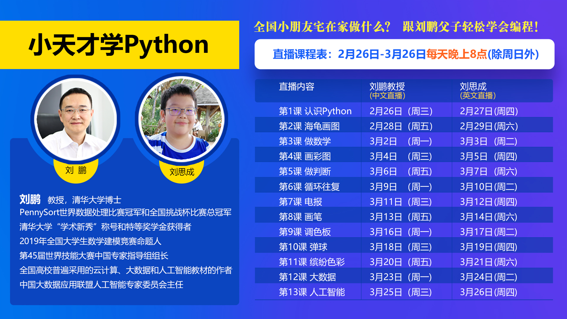 2020年寒假很漫長,特別是隨著各地的大專院校、中小學、幼兒園紛紛推遲開學,開學時間仍然待定。停課不停學,宅在家的朋友們一起跟隨劉鵬教授父子輕松學習編程吧!
