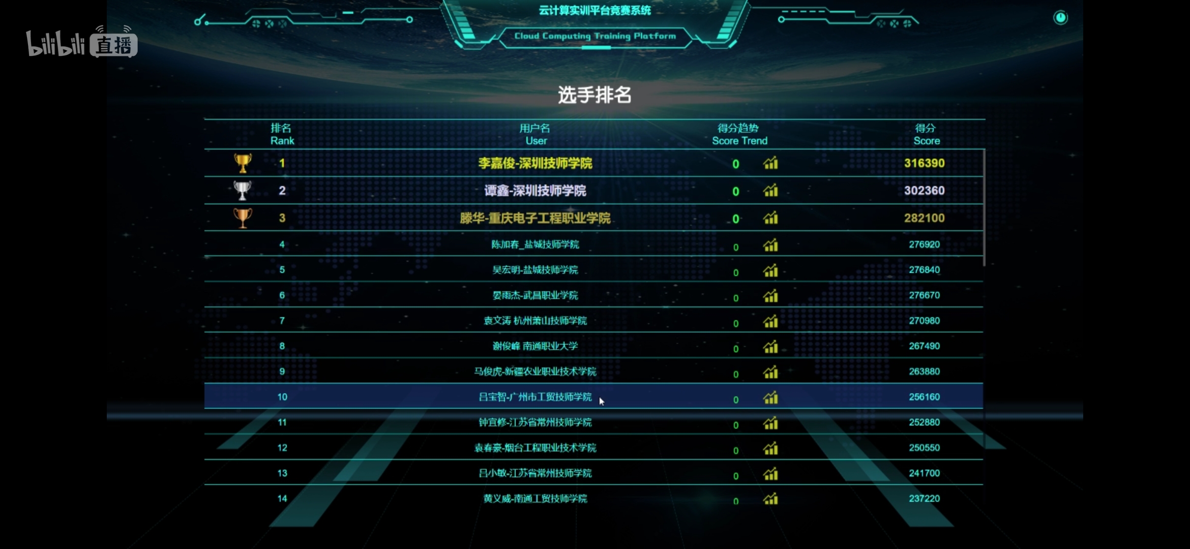 在練兵后半段,排名暫時靠后的選手毫不松懈,黑馬不時出現,其激烈程度可想而知。18點,練兵圓滿落下帷幕,本場勝出的十位選手脫穎而出。至此為止,進入到“云計算技能在現終考”的選手全部公布,具體名單如下: