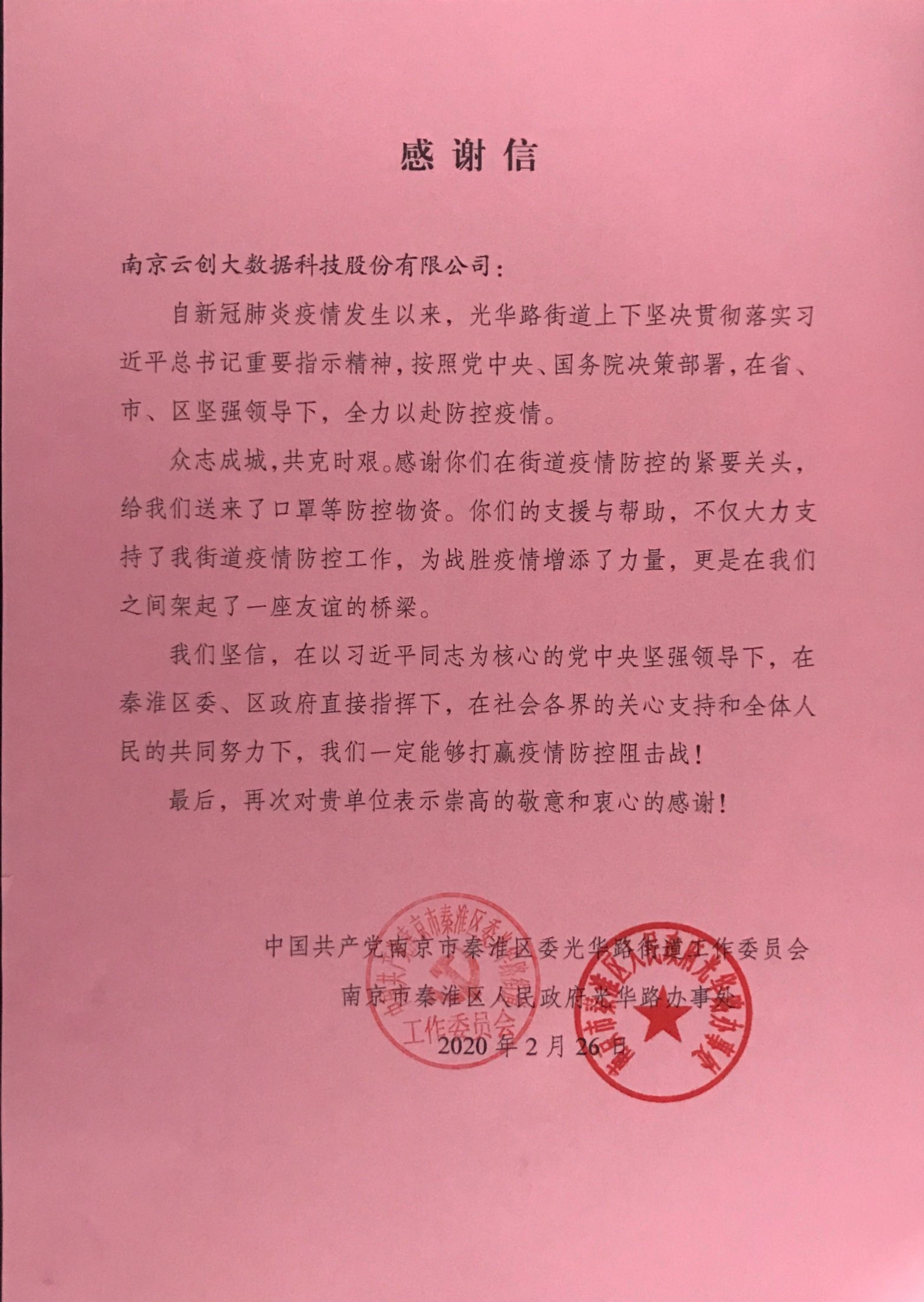 2月26日,在愛心口罩的捐贈活動上,秦淮區婦聯黨組書記、主席謝慧,光華路街道工委副書記、組織委員、政法委員溫秀芬和紀工委書記譚咸昭等領導,熱情歡迎云創大數據防疫物資的到來并表示感謝。光華路街道在感謝信中說道“你們的支援與幫助,不僅大力支持了我街道的疫情防控工作,為戰勝疫情增添了力量,更在我們之間架起了一座友誼的橋梁。”