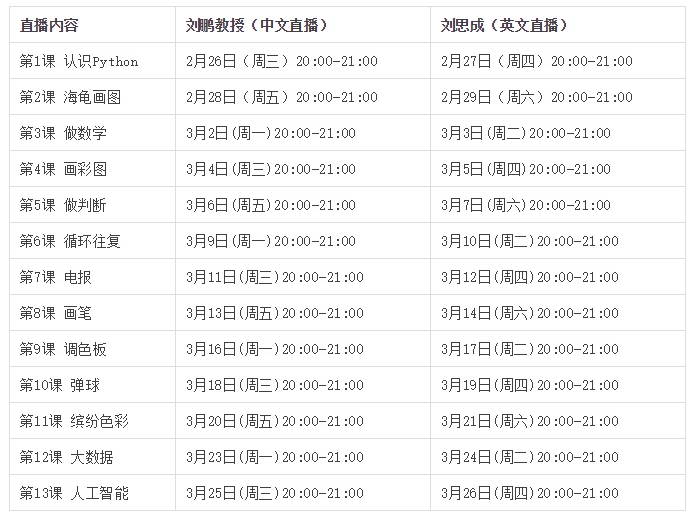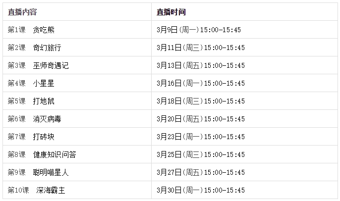 如此有趣又免費的課程,各位家長是不是已經(jīng)心動了?那就關(guān)注下面的課程表,學(xué)習(xí)起來吧。錯過的課程也不要擔(dān)心,我們還為大家準(zhǔn)備了錄播視頻的鏈接。2月26日-3月30日,歡迎家長和孩子一起來學(xué)習(xí)。