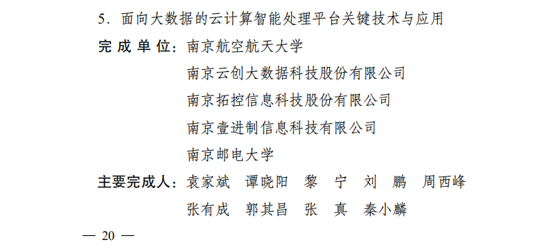 “面向大數據的云計算智能處理平臺關鍵技術與應用”由南京航空航天大學、南京云創大數據科技股份有限公司、南京拓控信息科技股份有限公司、南京壹進制信息科技有限公司、南京郵電大學共同完成。該項成果的研發和獲獎,展現出云創大數據等單位雄厚的研發實力和前沿的創新技術。