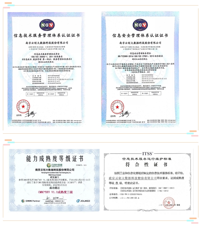 【科】用科技優化世界,這是“大智移云”時代發展的遠景,也是云創大數據奮力前行的企業愿景。目前云創大數據已申請專利、著作權、商標百余項,通過了ISO9001質量管理體系、ISO27001信息安全管理體系、ISO20000信息技術服務管理體系、ITSS三級以及CMMI三級認證。面向未來,云創大數據繼續攜手合作伙伴,共同創造智能數據新成果,讓人人悅享科技的力量。