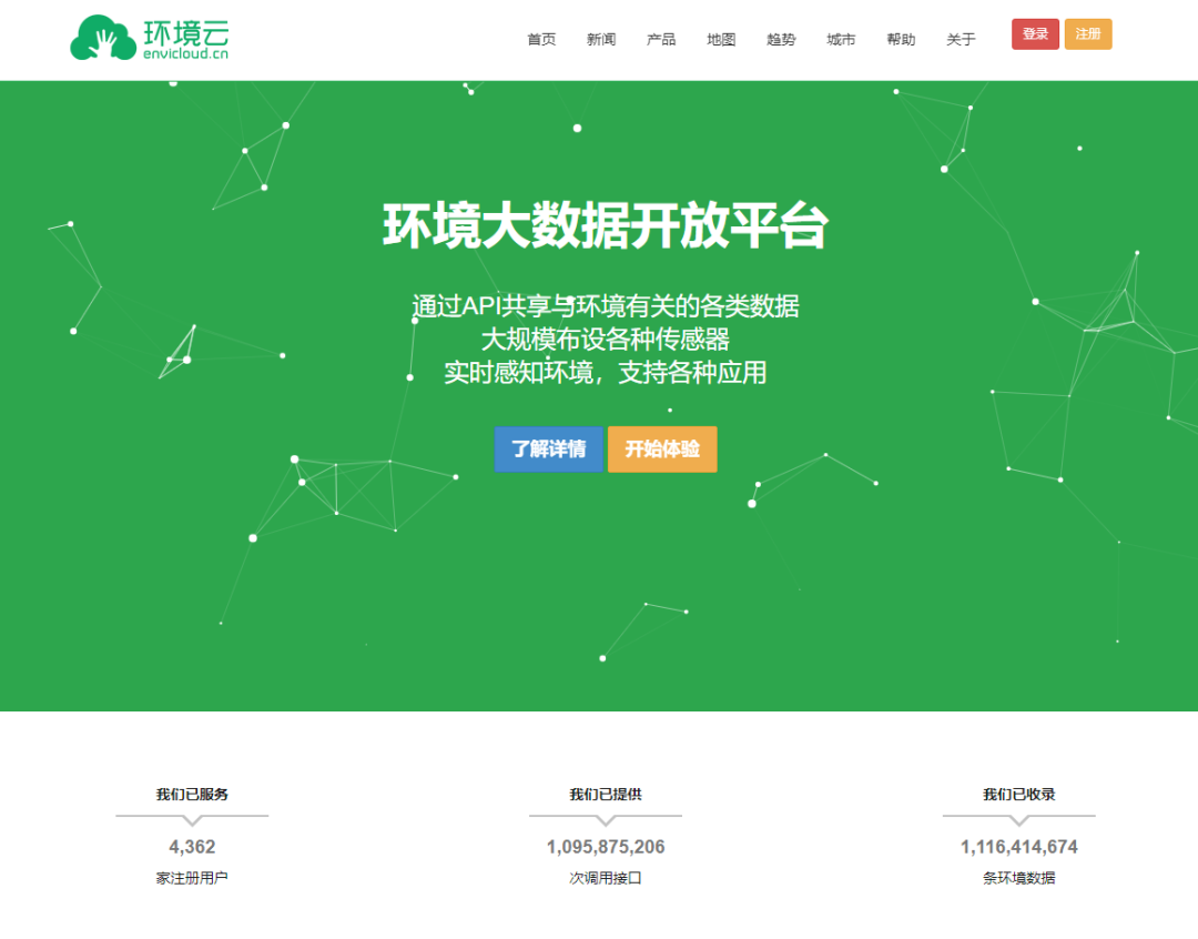 環境云可為環境應用開發者提供豐富可靠的氣象、環境、災害以及地理數據服務。此外,環境云還為環境研究人員提供了歷史數據報表下載,并向公眾展示環境實況。目前,環境云已服務4300余家注冊用戶,已收錄11億余條環境數據。