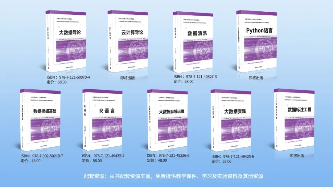 同樣出自云創大數據團隊的“大數據應用人才培養系列教材”已由清華大學出版社出版,內容覆蓋大數據導論、數據清洗、Python語言、R語言、大數據實踐等豐富內容,可作為全國高職院校大數據專業叢書。