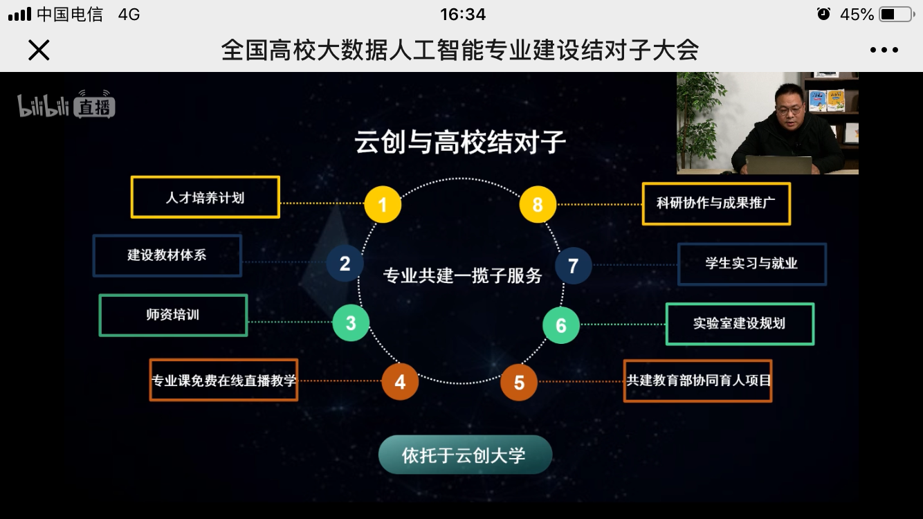 在高校—云創(chuàng)結(jié)對(duì)子方案介紹環(huán)節(jié),外聯(lián)負(fù)責(zé)人沈大為針對(duì)云創(chuàng)正式推出的大數(shù)據(jù)、人工智能專業(yè)共建一攬子服務(wù),進(jìn)行了細(xì)致分享。沈大為介紹到,云創(chuàng)會(huì)為結(jié)對(duì)子院校提供全套免費(fèi)服務(wù),包括共同制定人才培養(yǎng)計(jì)劃、建設(shè)教材體系、高質(zhì)量免費(fèi)培養(yǎng)師資、全套專業(yè)課高質(zhì)量免費(fèi)在線直播教學(xué)、設(shè)計(jì)實(shí)驗(yàn)室建設(shè)方案、協(xié)助學(xué)生實(shí)習(xí)、協(xié)助學(xué)生高質(zhì)量就業(yè)、共建教育部協(xié)同育人項(xiàng)目、聯(lián)合科研項(xiàng)目申報(bào)與研究、聯(lián)合發(fā)表高質(zhì)量論文、聯(lián)合科研成果報(bào)獎(jiǎng)、助力科研成果轉(zhuǎn)化等,切實(shí)幫助高校專業(yè)建設(shè)快速落地。
