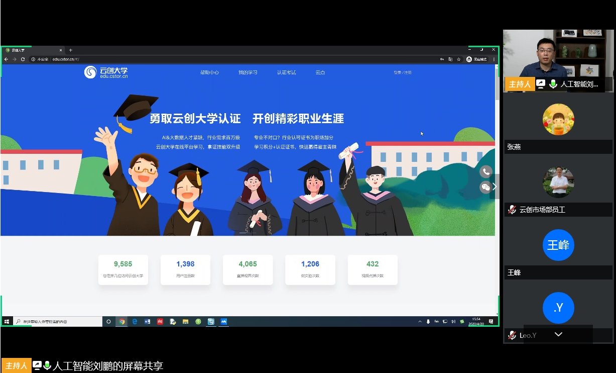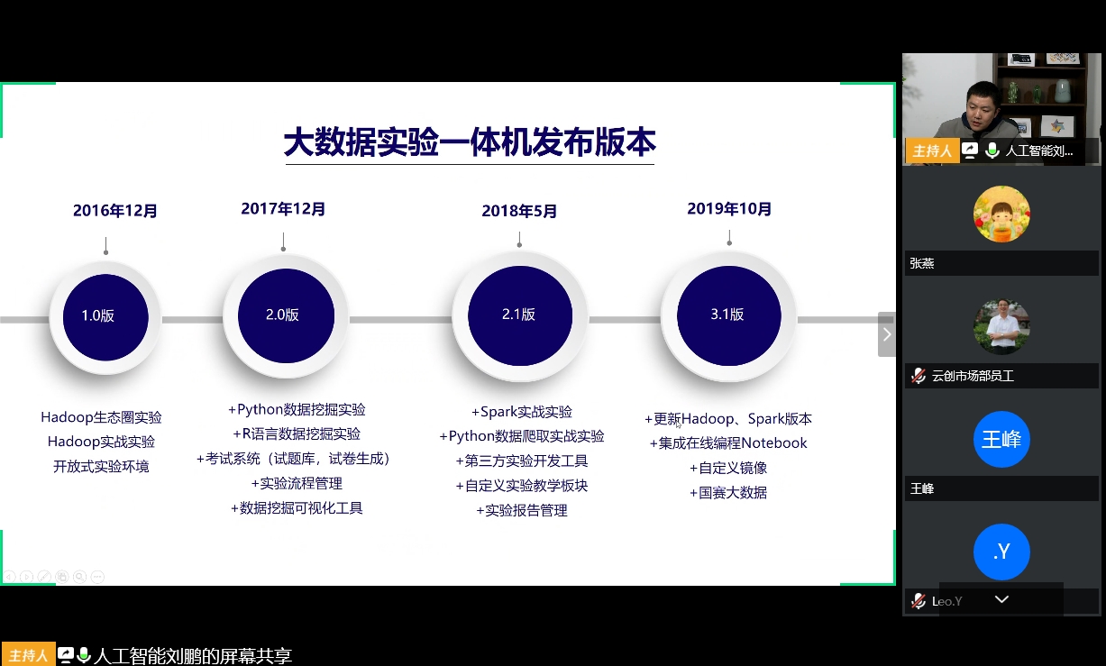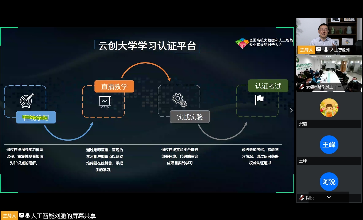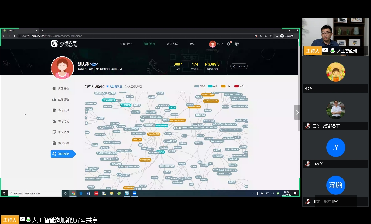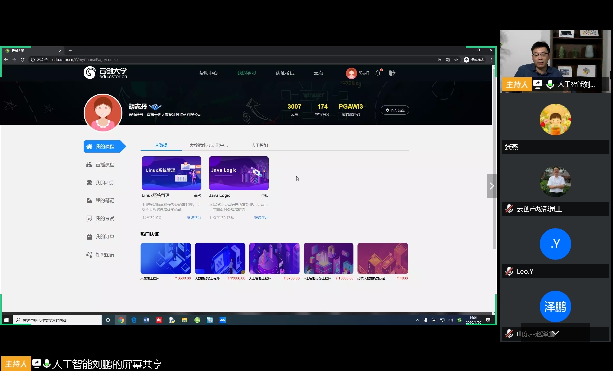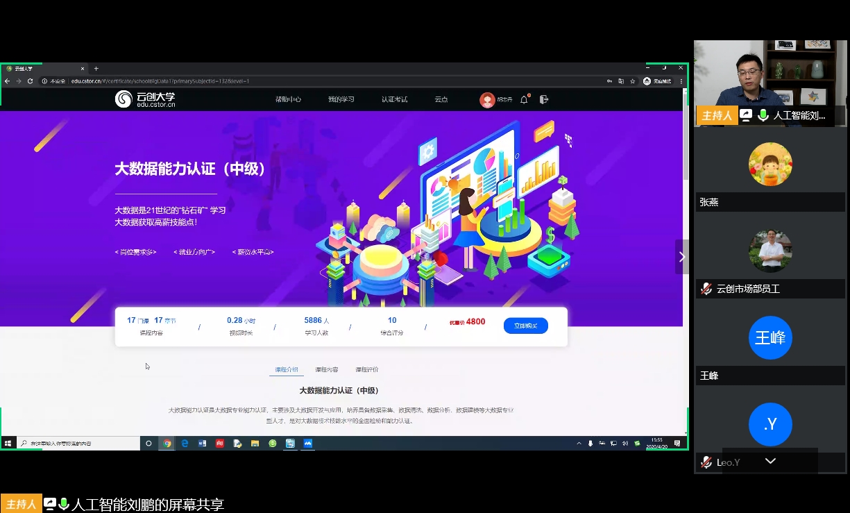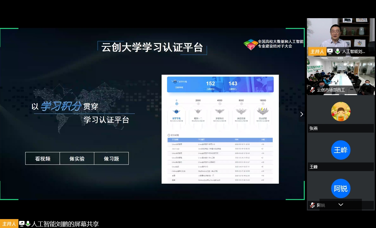 最后,針對此前劉鵬教授介紹的云創大學平臺,楊震宇經理進行了細致的講解與演示,包括平臺課程、積分、云點等,并通過具體課程內容梳理和導學視頻,使在線合作伙伴對云創大學平臺建立了更為直觀系統的認識,相信通過云創大學平臺體系的系統訓練,可向社會輸出更多高水平的大數據與人工智能人才。