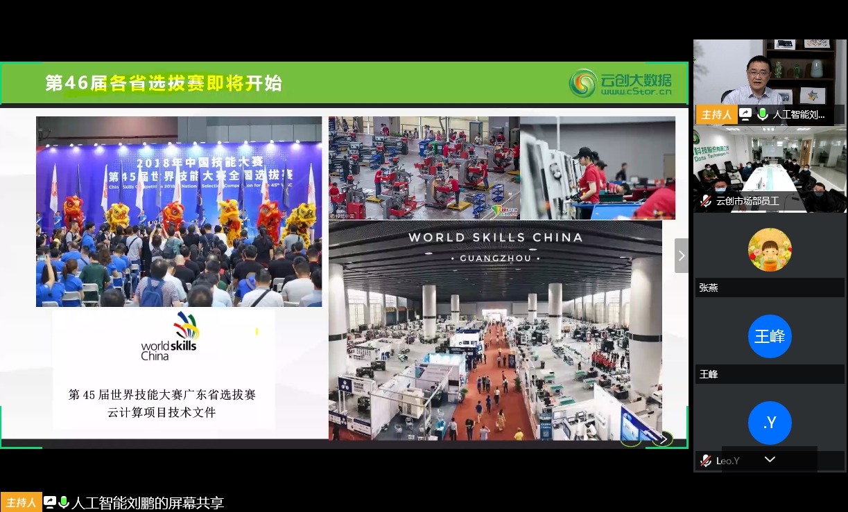 在世界技能大賽賽事介紹部分,劉鵬教授指出,目前社會各行業對云計算專業技能人才求賢若渴,第45屆世界技能大賽更是新增云計算項目。針對相關院校備戰技能大賽的需求,云創大數據開發了綜合的云計算實訓平臺,包括學習、實驗與競賽功能,可為云計算技能大賽學習、實驗和備賽提供平臺與應用支持,并在今年年初的“云計算在線培訓練兵”中得以應用,廣受認可和好評。