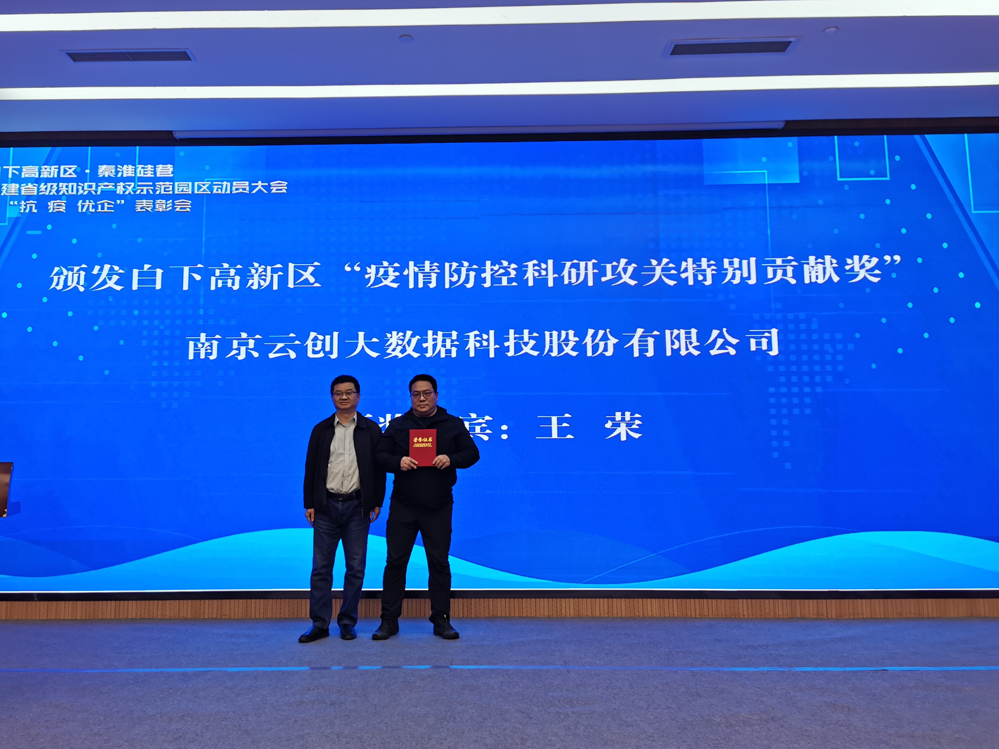會(huì)上,云創(chuàng)大數(shù)據(jù)憑借在2020年新冠肺炎疫情防控科研工作中的突出表現(xiàn),榮膺白下高新區(qū)“疫情防控科研攻關(guān)特別貢獻(xiàn)獎(jiǎng)”。外聯(lián)負(fù)責(zé)人沈大為作為云創(chuàng)代表領(lǐng)取了證書,南京市知識(shí)產(chǎn)權(quán)局戰(zhàn)略推進(jìn)處處長(zhǎng)王榮為其頒獎(jiǎng)。此外,沈大為還在大會(huì)上作了“知識(shí)產(chǎn)權(quán)在企業(yè)發(fā)展過(guò)程中的重要性”的主題分享。