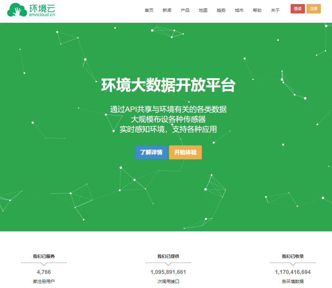 作為環(huán)境大數(shù)據(jù)開放平臺(tái),環(huán)境云通過(guò)大規(guī)模部建各類環(huán)境監(jiān)測(cè)傳感器采集數(shù)據(jù),同時(shí)集成第三方專業(yè)數(shù)據(jù)源發(fā)布的數(shù)據(jù),結(jié)合相關(guān)數(shù)據(jù)預(yù)測(cè)模型生成的預(yù)報(bào)數(shù)據(jù),依托數(shù)據(jù)托管服務(wù)平臺(tái)——萬(wàn)物云提供的數(shù)據(jù)存儲(chǔ)服務(wù),配合代碼示例和詳盡的接口使用說(shuō)明,為環(huán)境應(yīng)用開發(fā)者提供豐富可靠的氣象、環(huán)境、災(zāi)害以及地理數(shù)據(jù)服務(wù)。此外,環(huán)境云還為環(huán)境研究人員提供了歷史數(shù)據(jù)報(bào)表下載,并向公眾展示環(huán)境實(shí)況。目前,環(huán)境云已服務(wù)4700余家注冊(cè)用戶,已收錄11億余條環(huán)境數(shù)據(jù)。