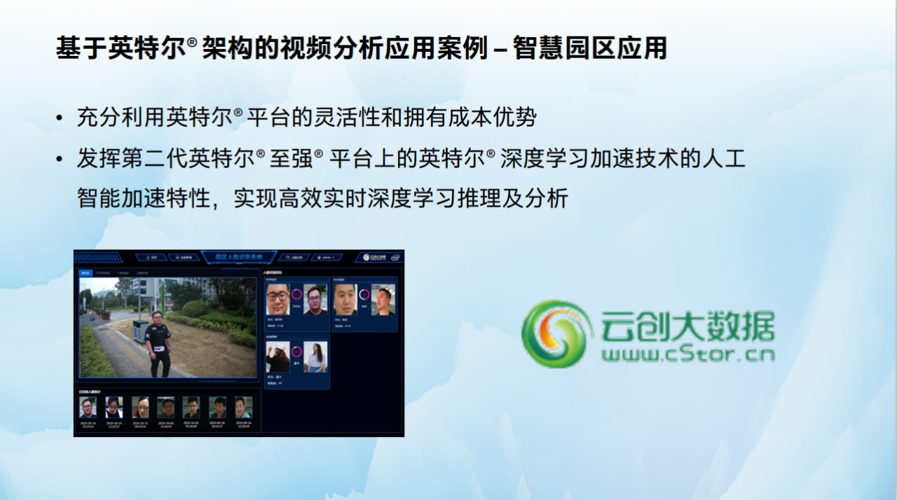 值得一提的是,云創大數據的智慧園區人臉識別系統、鐵路病態非接觸檢測系統這兩款熱門產品,在市場上收獲行業用戶的頗多好評。其實,這兩款產品都是云創大數據前沿應用結合英特爾先進技術成功落地的人工智能具體實例。此外,在云創大數據參與的新冠肺炎疫情走勢預測中,也離不開英特爾提供的人工智能技術支持。