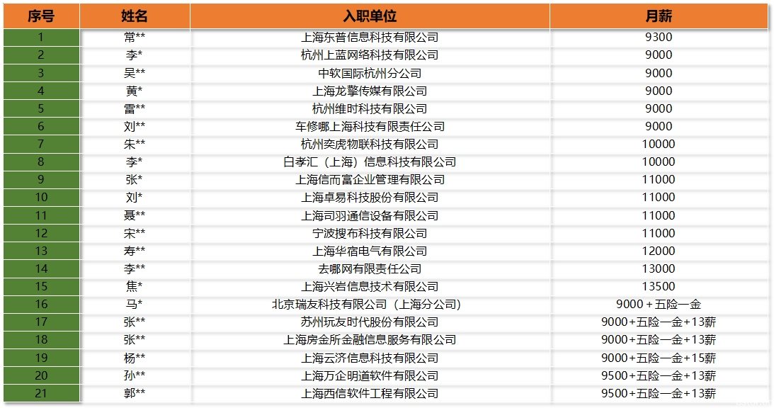 通過云創(chuàng)的培訓,某民辦三本院校畢業(yè)生起薪平均超過10000元。以下為其部分學生就業(yè)單位和月薪:
