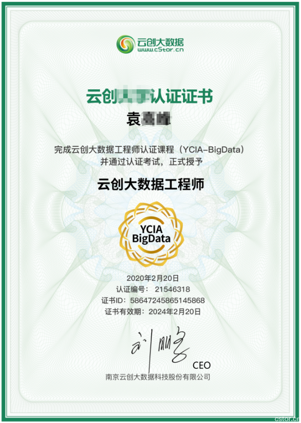畢業(yè)證書:工信部教育與考試中心+云創(chuàng)智學大數據高級工程師雙證書